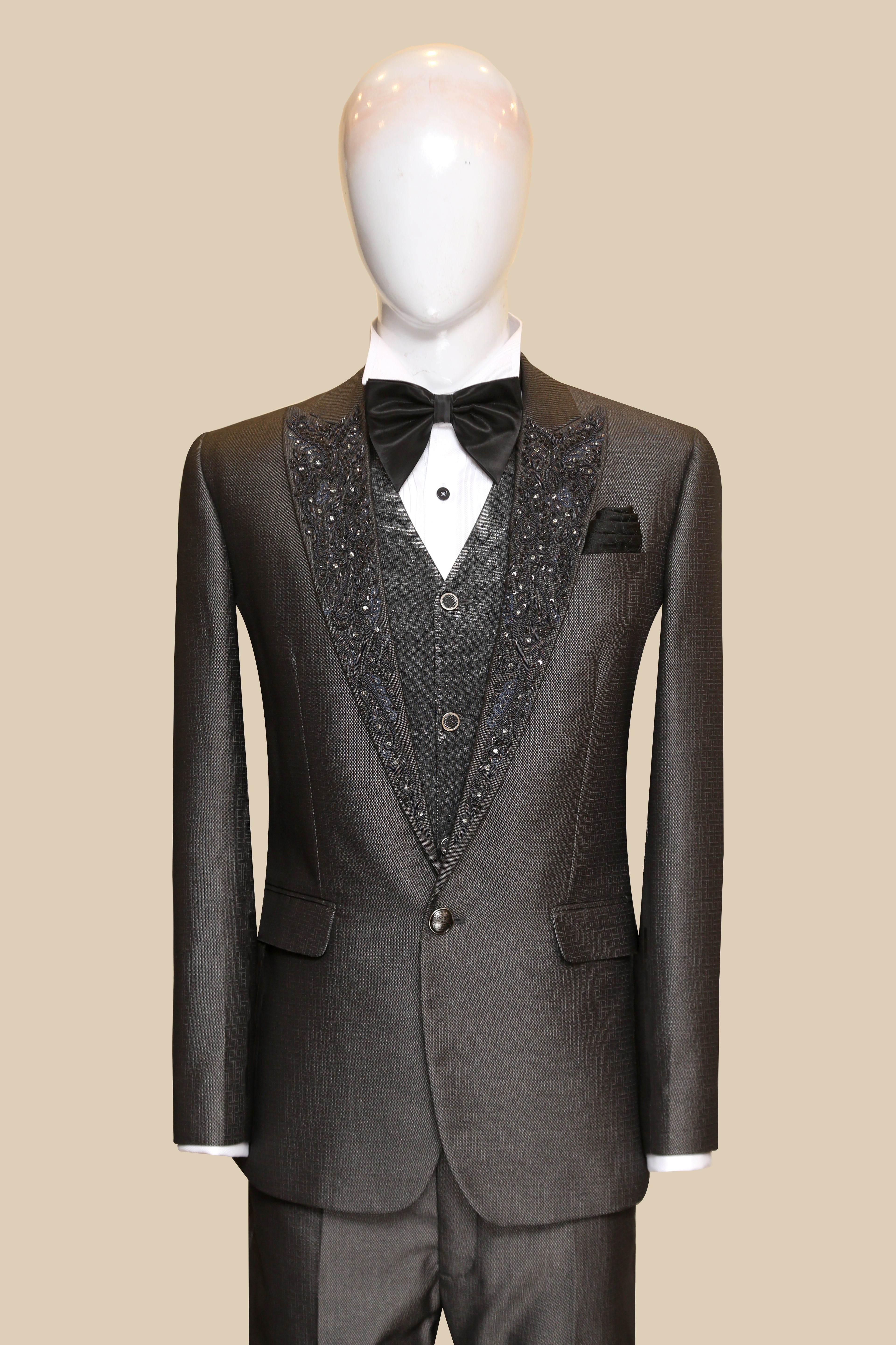 | All seasons Tropical Shine Fabric (especially For Tuxedo) Three Piece Tuxedo Suit with Embellishment on Peak Lapel. Actual product color may vary slightly from the image.v |